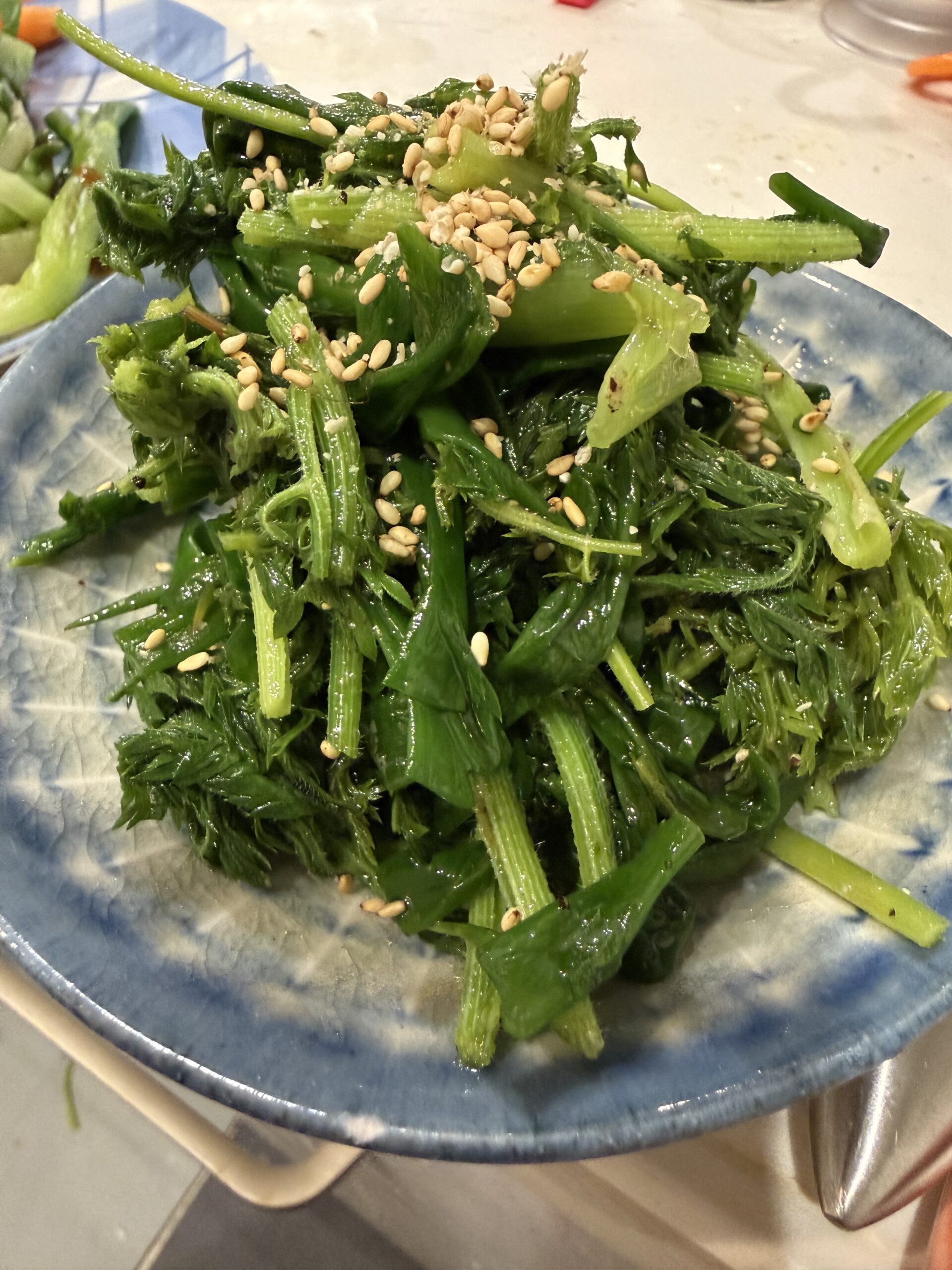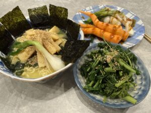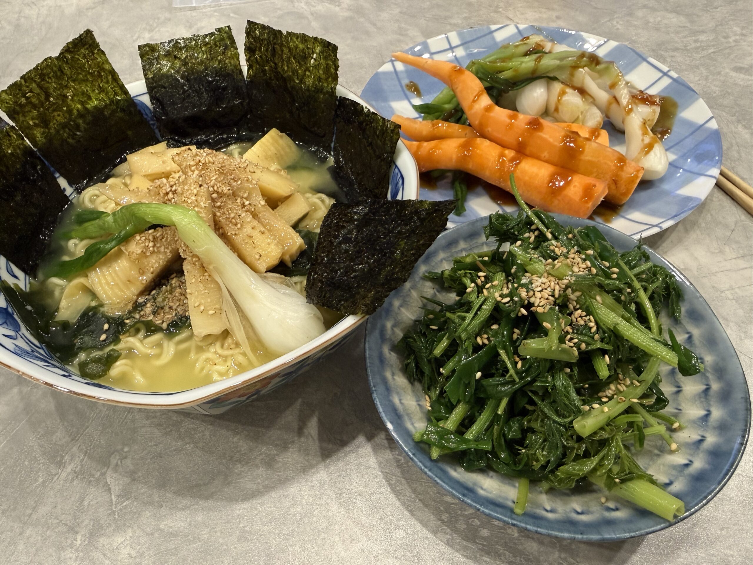 未分類 今夜も旬を頂く 2026年4月9日 noko コメントする 今夜のタケノコは少し甘辛にして… メンマ風に❣️ 生の人参🥕とワケギの玉の所は胡麻みそで。 ワケギの葉っぱと人参の葉っぱは… ナムルに❣️ 甘辛タケノコは塩ラーメンにのせて 頂きましたとさ❣️ 人参もナムルもタケノコも全く食べきれず…明日へ持ち越し〜💦