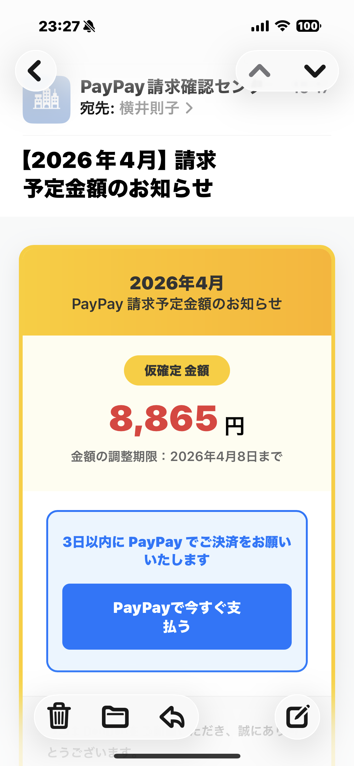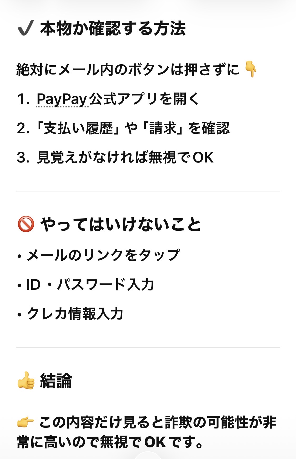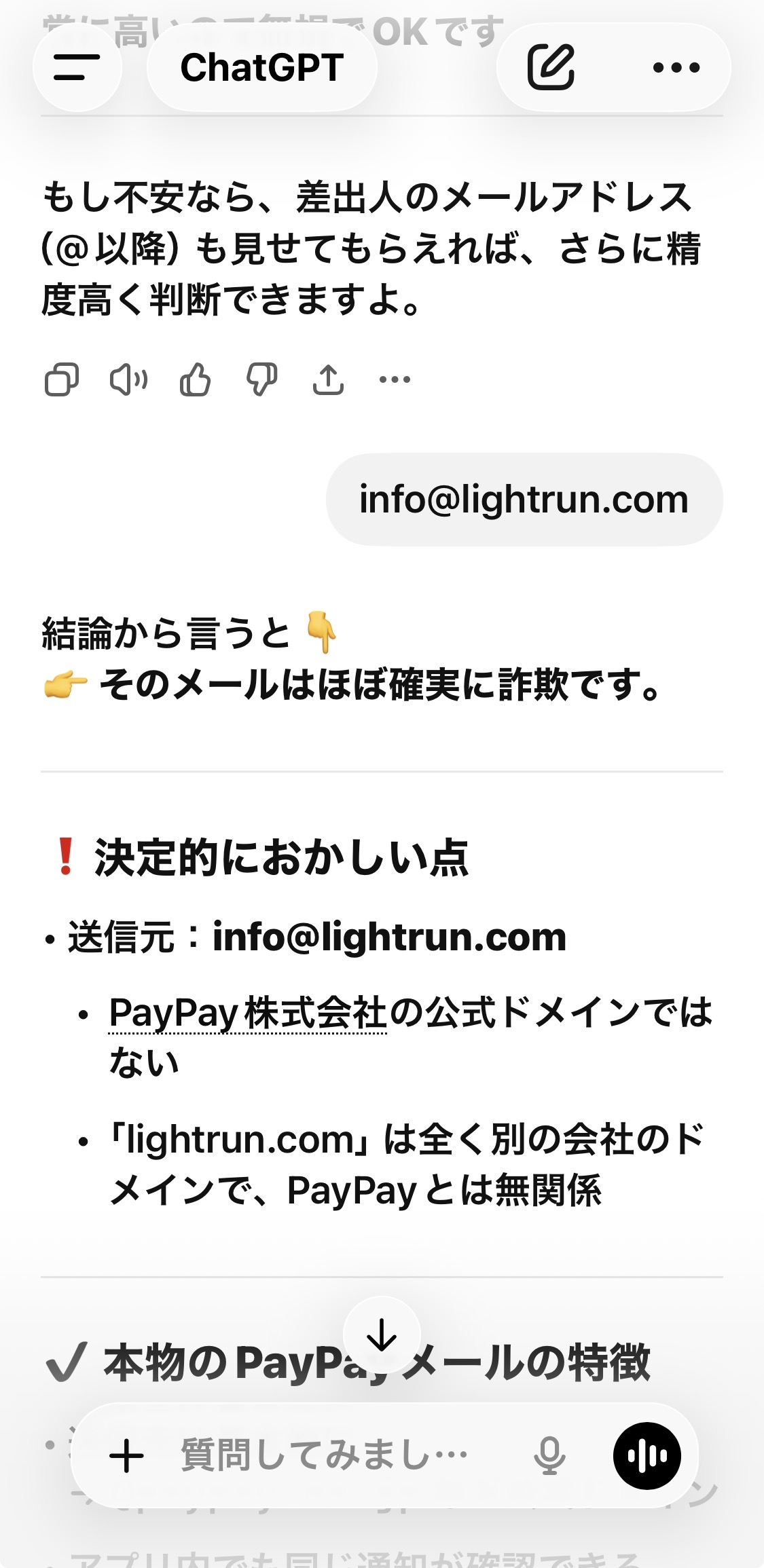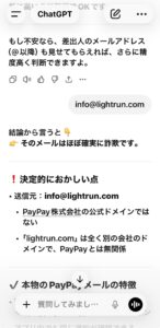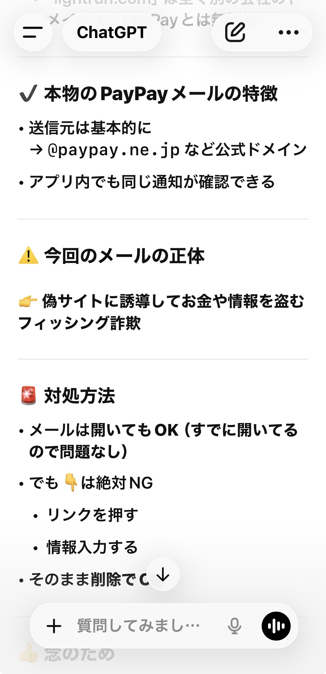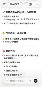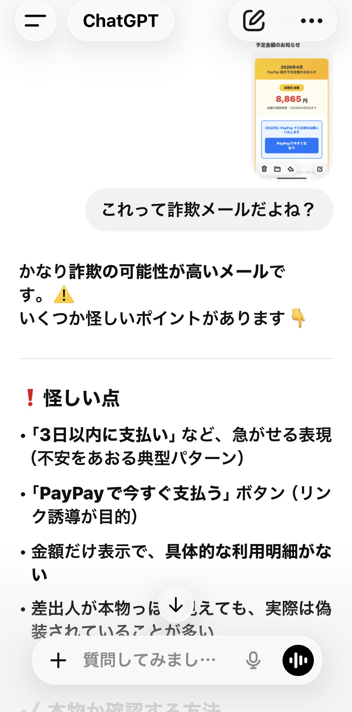 未分類 詐欺には気をつけよう 2026年4月8日 noko コメントする メールがちゃんと見えるようになったけど… こんな危ないメールもやってくる。 そこでchatGTPさんにも聞いてみたよ。 完全に詐欺だよね。 こんなのウッカリPayPayで支払うなんてボタン押したら、PayPayからお金抜かれてしまう。 PayPayを使ってる皆さんは十分に気をつけてくださいね。 世の中は危険がいっぱいだね⚠️ Screenshot チャッピーさんありがとう。 Screenshot いいね:いいね 読み込み中…