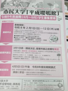 未分類 平成嚶鳴館講座申し込み始まりました 2026年2月2日 noko コメントする 東海市民大学平成嚶鳴館の4〜9月の前期講座申し込みがスタートしました。 申し込みがまだの方はよろしくお願いします。 申し込みは平成嚶鳴館のHPからもできますよ。 お待ちしています。